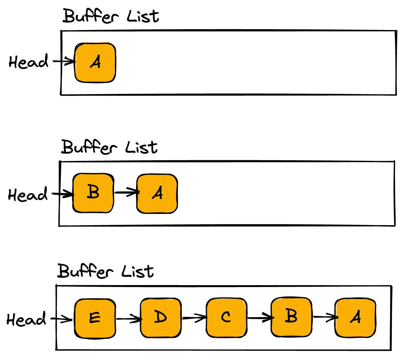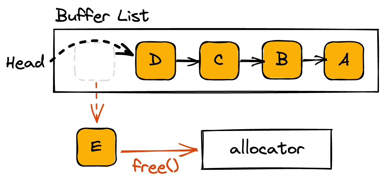 - An internal buffer_list: is a singly linked list◹ to keep track of the allocated buffers.