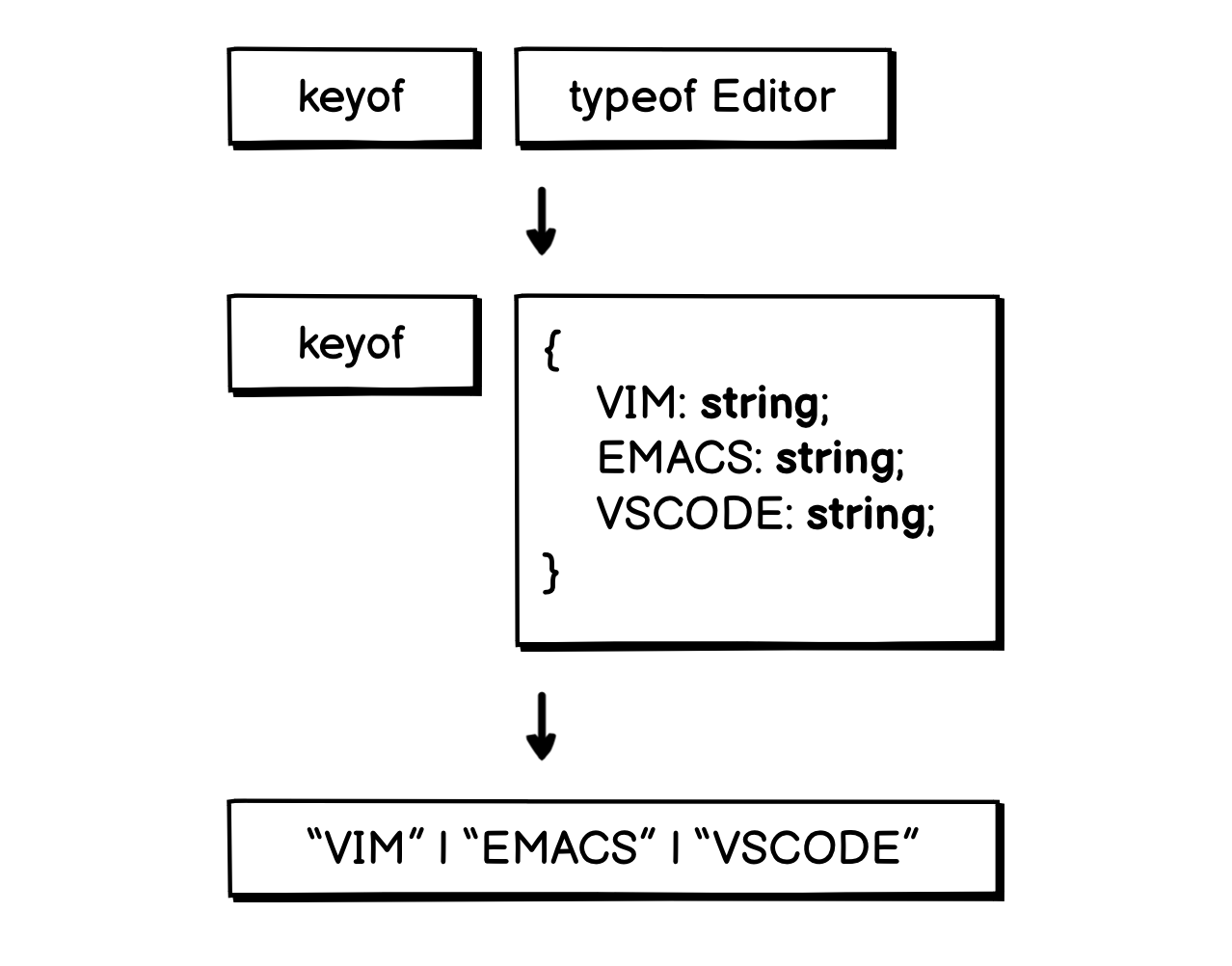 So, from the example in the previous article, when writing keyof typeof Editor, we actually get the typeof Editor, and pass the result into the keyof call: